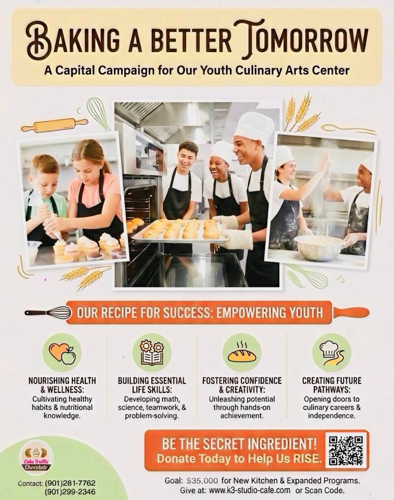 Your donation empowers K3 STUDIO CAFE to teach baking skills, support job placements, and nourish our community. Join us in creating sweet opportunities for local youth in Cordova, Tennessee.